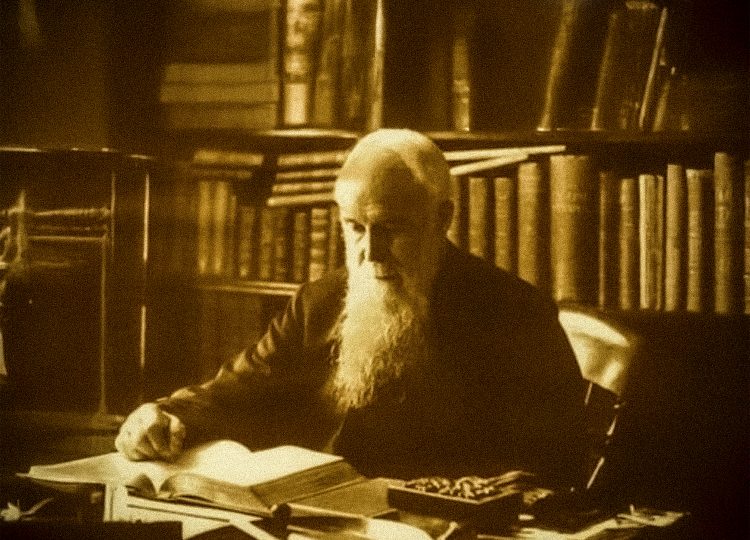 "Op de grote, stille heide dwaalt een herder eenzaam rond, wijl de witgewolde kudde trouw bewaakt wordt door de hond."