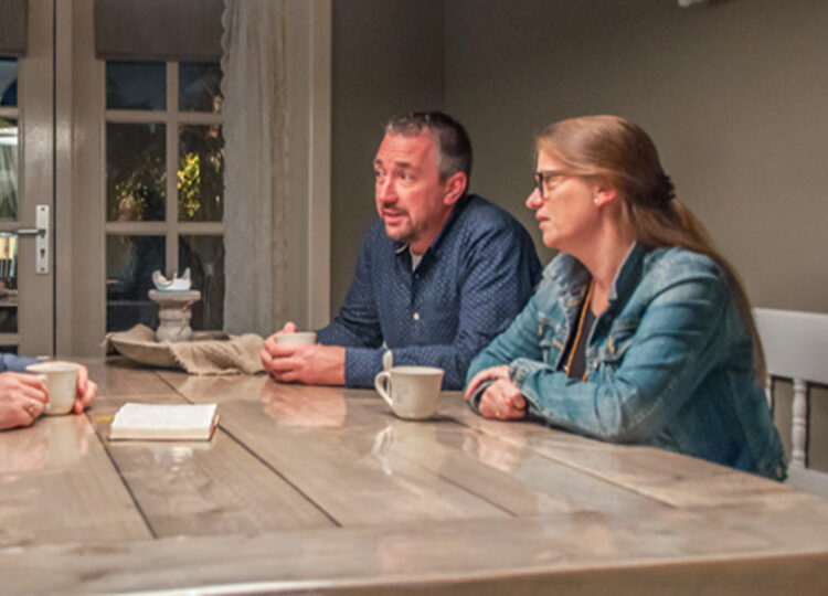 Waar haalt een ouderling de vrij-moedigheid vandaan om op huisbe-zoek te gaan? Dat heeft te maken met het feit dat de apostel Paulus de ouderlingen van de gemeente in Efeze opdraagt: ‘Zie dan toe op uzelf en op heel de kudde, te midden waarvan de Heilige Geest u tot opzieners aangesteld heeft om de gemeente van God te weiden, die Hij verkregen heeft door Zijn eigen bloed.’ (Hand.20:28) De christelijke gemeente wordt hier vergeleken met een kudde schapen, die de goede Herder heeft gekocht met Zijn bloed. De ouderlingen, opzie-ners, krijgen de opdracht om her-derlijke zorg aan de gemeenteleden te besteden. In het Nieuwe Testament wordt deze opdracht niet alleen aan ambtsdra-gers gegeven. In Romeinen 12:8 schrijft Paulus dat de Heilige Geest aan sommige gemeenteleden de gave schenkt van het ‘bemoedigen’. Deze gave ligt in de lijn van de opdracht: ‘Ver-blijd u met hen die blij zijn en huil met hen die huilen.’ (Rom.12:15) We komen hier in aanraking met de bijbelse grond-lijn dat de Geest aan gelovigen gaven schenkt waarmee zij de gemeenten mogen dienen. Hij ‘heiligt’ hun schep-pingsgaven, zoals met aandacht kunnen luisteren, goed kunnen aanvoelen wat mensen innerlijk beweegt en zich in mensen kunnen verplaatsen; stuk voor stuk gaven waardoor zij in staat zijn de ander nabij te zijn. Vandaar dat in veel gemeenten ouderlingen sámen met een ‘bezoekbroeder’ op huisbezoek gaan. Daarnaast zijn er in sommige gemeen-ten pastorale teams en gaat een ouder-ling met een bezoekzuster op pad, bij-voorbeeld wanneer een weduwe wordt bezocht. De ouderling kan zich immers wat ongemakkelijk voelen om zo’n be-zoek als man alleen af te leggen en een alleenstaande vrouw kan zich, zeker wanneer de ouderling een bezoekbroe-der meebrengt, opgelaten voelen. De aanwezigheid van een bezoekzuster kan ontspannend werken en het gesprek ten goede komen.
